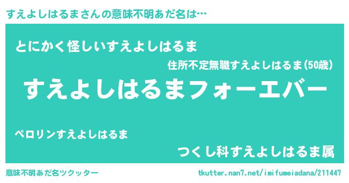 | 男性向けラノベタイトル風あだ名 | 『すえよしはるまに滅ぼされるだけの簡単なお仕事です』 |