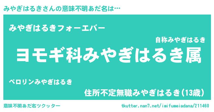 | 男性向けラノベタイトル風あだ名 | 『みやぎはるきに滅ぼされるだけの簡単なお仕事です』 |