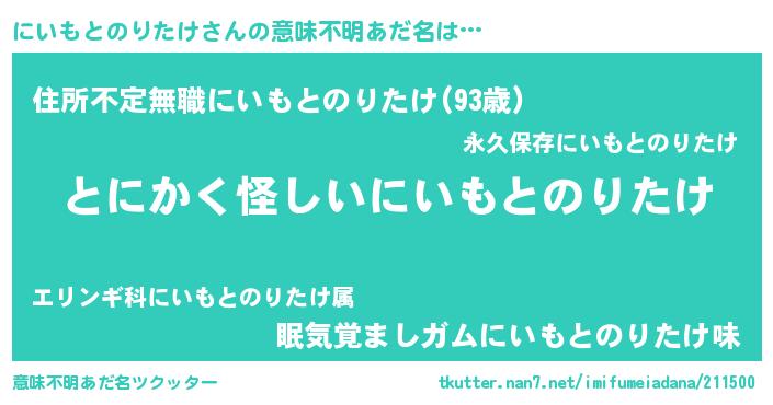 | 男性向けラノベタイトル風あだ名 | 『にいもとのりたけの嫁は女の子じゃないと思った?』 |