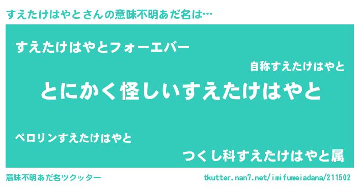 | 男性向けラノベタイトル風あだ名 | 『すえたけはやとの嫁は女の子じゃないと思った?』 |