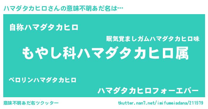 | 男性向けラノベタイトル風あだ名 | 『転生したらハマダタカヒロだった件』 |