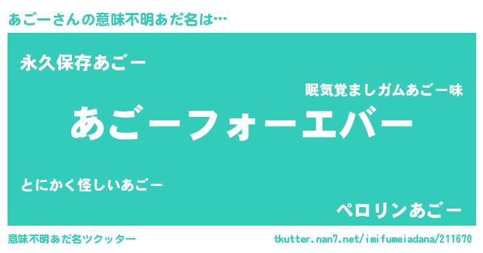 | ファンタジー風あだ名 | 『エターナルアゴーー』『アゴディッシュ』 |