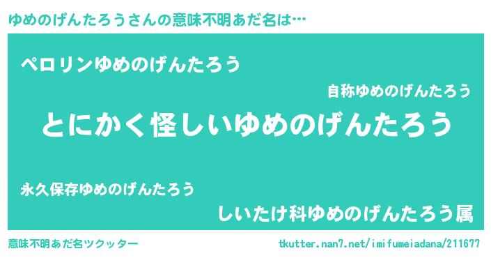 | 男性向けラノベタイトル風あだ名 | 『ゆめのげんたろうの嫁は女の子じゃないと思った?』 |