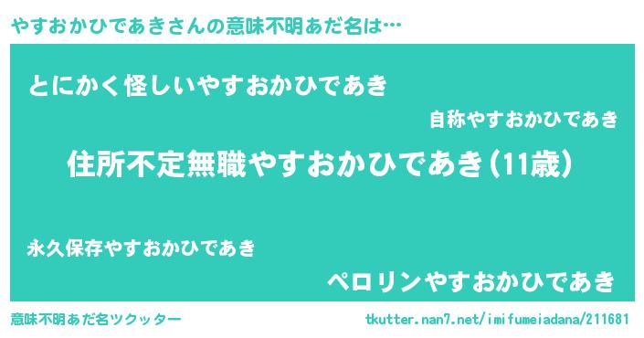 | 男性向けラノベタイトル風あだ名 | 『やすおかひであきに滅ぼされるだけの簡単なお仕事です』 |