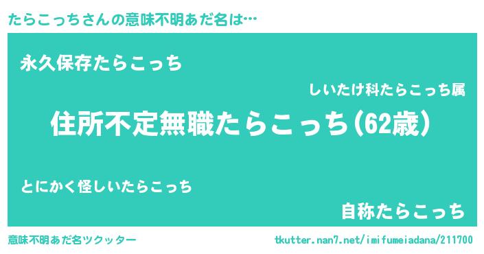 | 男性向けラノベタイトル風あだ名 | 『この素晴らしい世界にたらこっちを!』 |