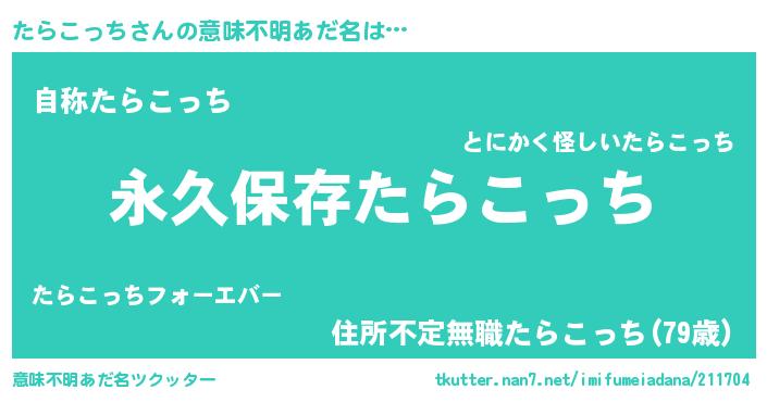 | 女子向けラノベタイトル風あだ名 | 『異世界でカフェたらこっちを開店しました。』 |