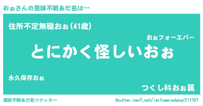 | 男性向けラノベタイトル風あだ名 | 『おぉに滅ぼされるだけの簡単なお仕事です』 |