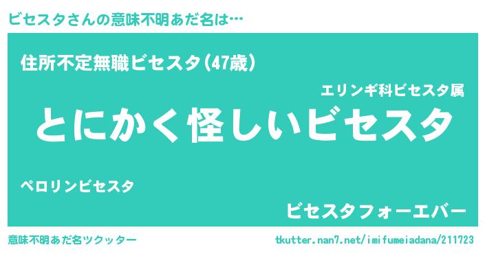 | 男性向けラノベタイトル風あだ名 | 『ビセスタの嫁は女の子じゃないと思った?』 |