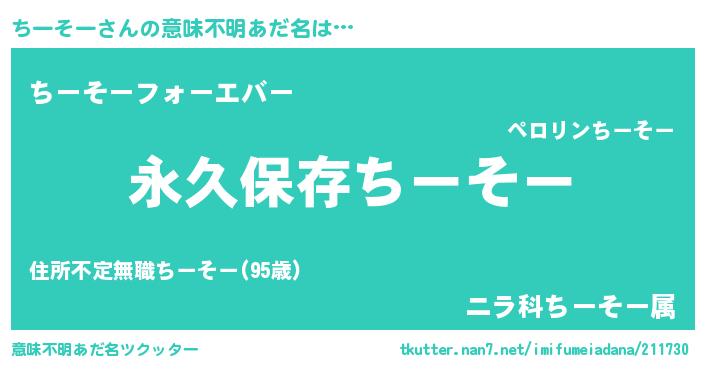 | 男性向けラノベタイトル風あだ名 | 『ちーそーという概念が存在しない退屈な世界 』 |