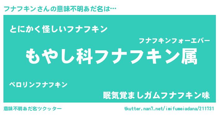 | 男性向けラノベタイトル風あだ名 | 『フナフキンに滅ぼされるだけの簡単なお仕事です』 |