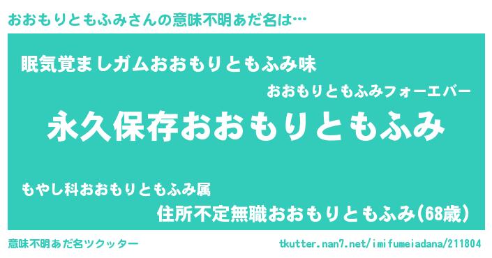 | 女子向けラノベタイトル風あだ名 | 『異世界でカフェおおもりともふみを開店しました。』 |