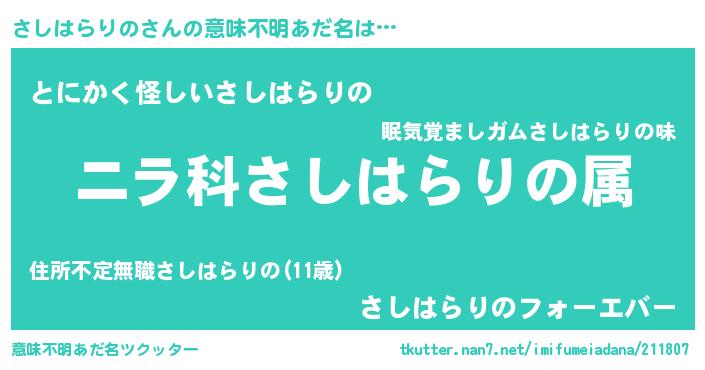 | 料理風あだ名 | 『さしはらりのの炊き込みご飯』 |