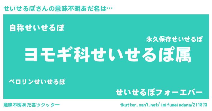 | 男性向けラノベタイトル風あだ名 | 『せいせるぽ~年齢イコール彼女いない歴の魔法使い~』 |