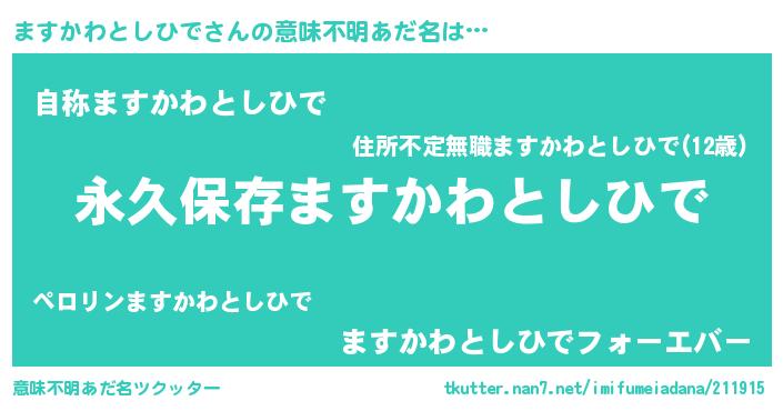 | 男性向けラノベタイトル風あだ名 | 『ますかわとしひでという概念が存在しない退屈な世界 』 |