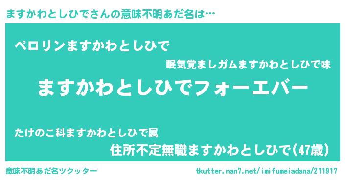 | 男性向けラノベタイトル風あだ名 | 『ますかわとしひでに滅ぼされるだけの簡単なお仕事です』 |