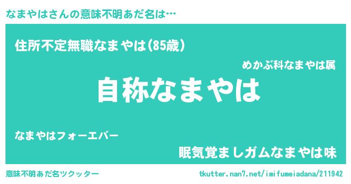 | 男性向けラノベタイトル風あだ名 | 『緋弾のナマヤハ』『ナマヤハスレイヤー』 |