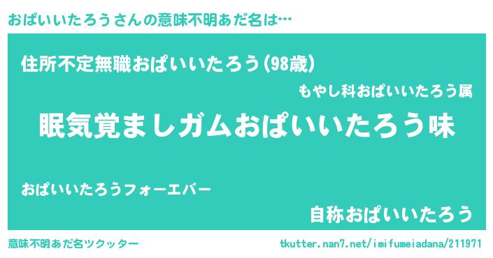 | 男性向けラノベタイトル風あだ名 | 『ノーゲーム・ノーオパイイタロウ』 |