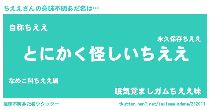 | 女子向けラノベタイトル風あだ名 | 『ちええの卵を拾いまして』 |