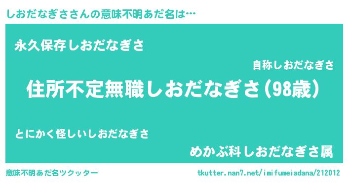 | 男性向けラノベタイトル風あだ名 | 『この素晴らしい世界にしおだなぎさを!』 |