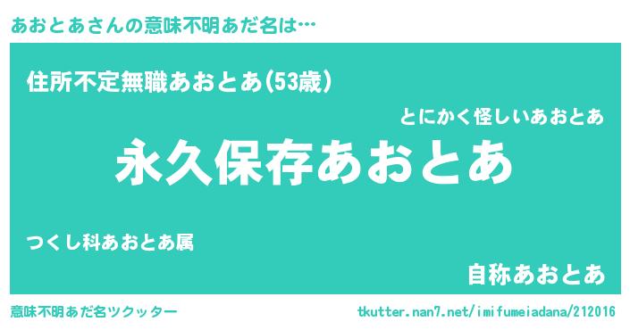 | 男性向けラノベタイトル風あだ名 | 『あおとあという概念が存在しない退屈な世界 』 |