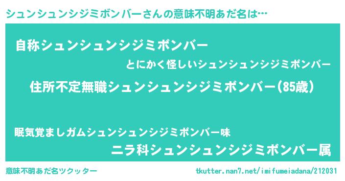 | 女子向けラノベタイトル風あだ名 | 『シュンシュンシジミボンバーが死なない童話 林檎のシュンシュンシジミボンバーの診療簿』 |