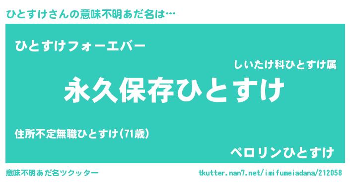 | 胡散臭い通販商品みたいなあだ名 | 『絶対に幸福をもたらす水素水…その名も「ひとすけ」』 |