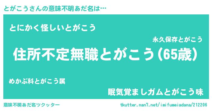 | 男性向けラノベタイトル風あだ名 | 『この素晴らしい世界にとがこうを!』 |