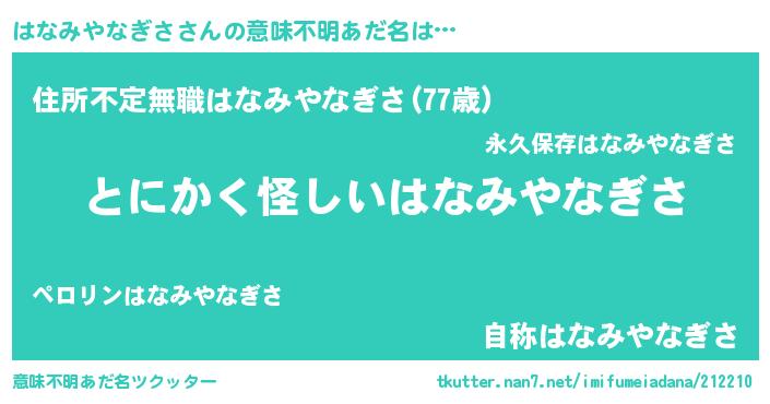 | ポケモン風あだ名 | 『ヒハナミヤナギサ』『ハーナイ』 |