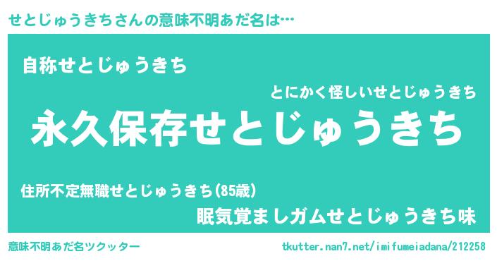 | ヘコむあだ名 | 『せとじゅうきち(小並感)』『せとっ子』 |