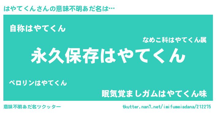 | 胡散臭い通販商品みたいなあだ名 | 『来世でも幸せになれる健康食品…その名も「はやてくん」』 |
