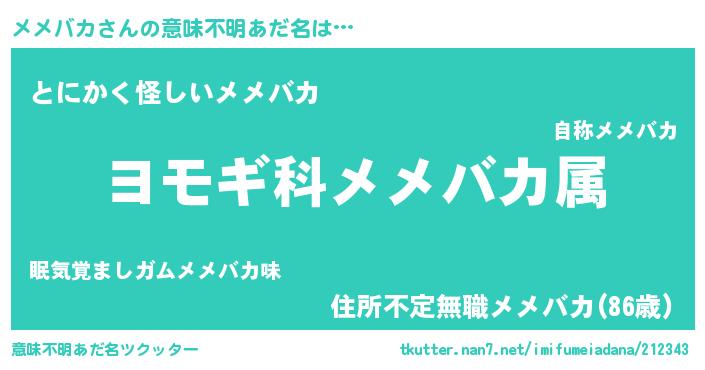 | 男性向けラノベタイトル風あだ名 | 『メメバカに滅ぼされるだけの簡単なお仕事です』 |