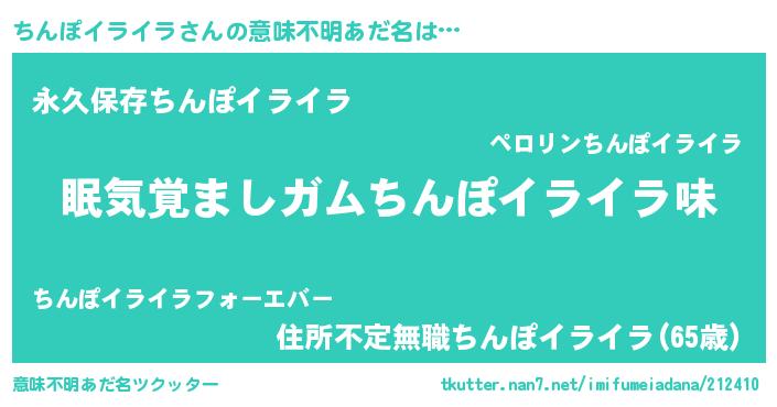 | 男性向けラノベタイトル風あだ名 | 『おまえをオタクにしてやるから、俺をちんぽイライラにしてくれ! 』 |