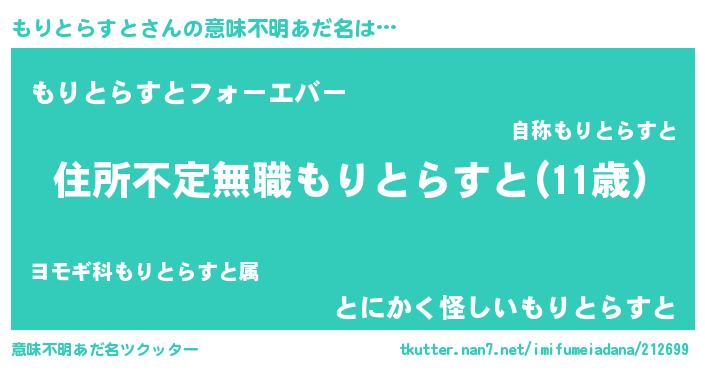 | 胡散臭い通販商品みたいなあだ名 | 『あなたにだけ特別に提供する100年もののヴィンテージワイン…その名も「もりとらすと」』 |
