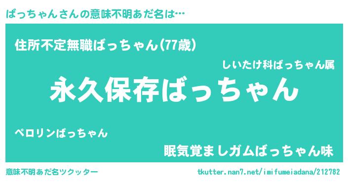 | 男性向けラノベタイトル風あだ名 | 『ばっちゃんという概念が存在しない退屈な世界 』 |