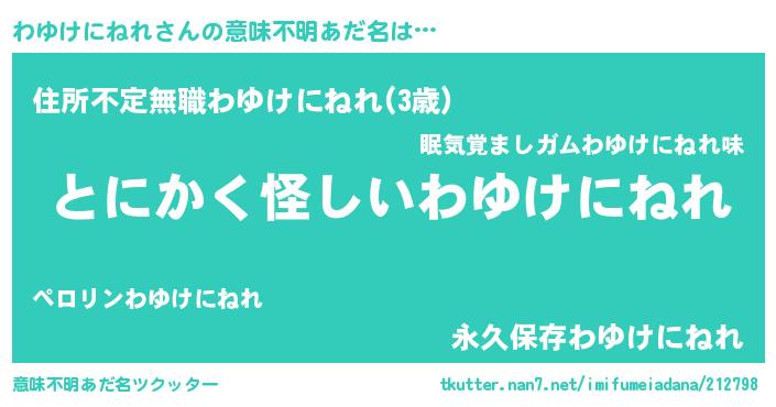 | 男性向けラノベタイトル風あだ名 | 『わゆけにねれの嫁は女の子じゃないと思った?』 |
