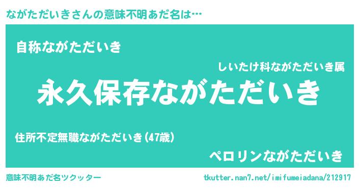 | 男性向けラノベタイトル風あだ名 | 『ながただいきという概念が存在しない退屈な世界 』 |