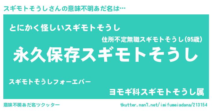 | ポケモン風あだ名 | 『ゼニスギ』『ヒスギモトソウシ』 |