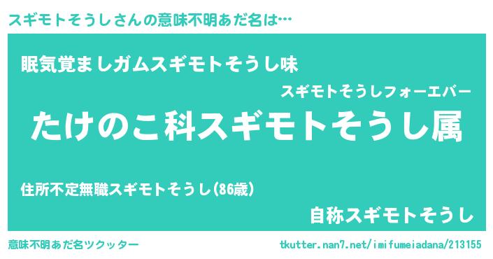| 男性向けラノベタイトル風あだ名 | 『転生したらスギモトそうしだった件』 |
