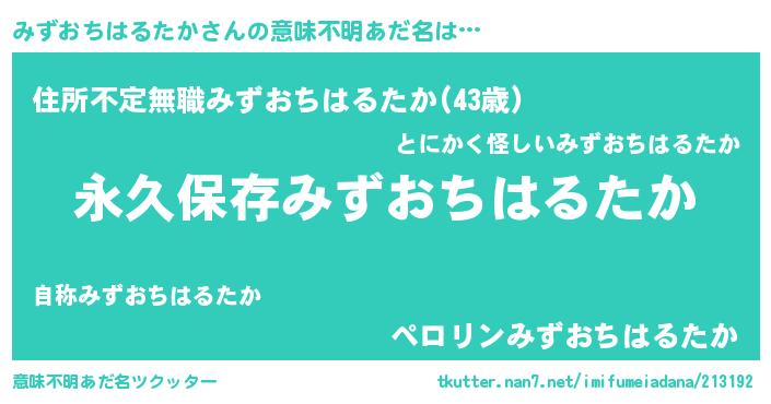 | ヘコむあだ名 | 『みずおちはるたか(遠い目)』『みずにゅー』 |