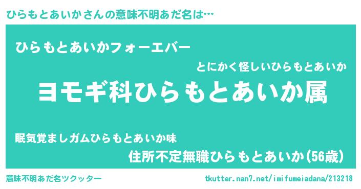 | 男性向けラノベタイトル風あだ名 | 『ひらもとあいか~年齢イコール彼女いない歴の魔法使い~』 |