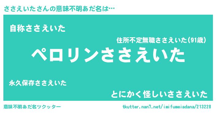 | 男性向けラノベタイトル風あだ名 | 『ささえいたに滅ぼされるだけの簡単なお仕事です』 |