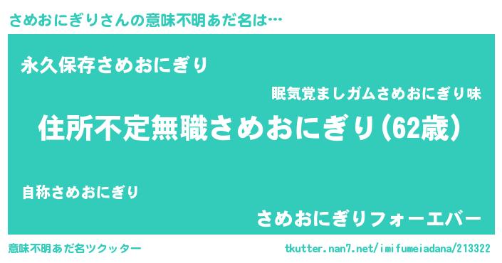 | 女子向けラノベタイトル風あだ名 | 『さめおにぎりが死なない童話 林檎のさめおにぎりの診療簿』 |
