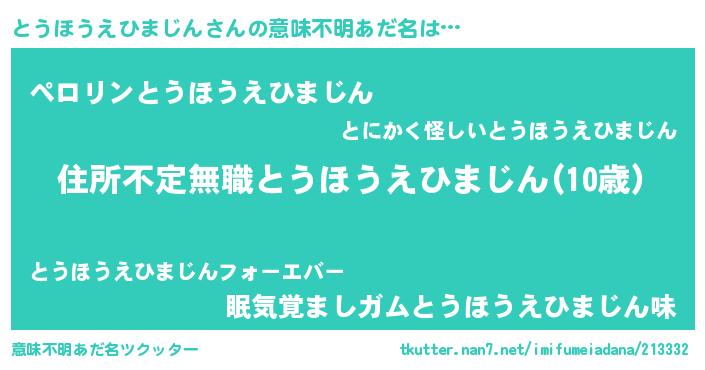 | 男性向けラノベタイトル風あだ名 | 『冴えないとうほうえひまじんの育てかた』 |