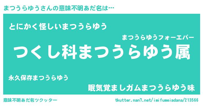 | 男性向けラノベタイトル風あだ名 | 『まつうらゆう~年齢イコール彼女いない歴の魔法使い~』 |