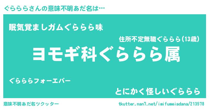 | 男性向けラノベタイトル風あだ名 | 『ぐららら~年齢イコール彼女いない歴の魔法使い~』 |