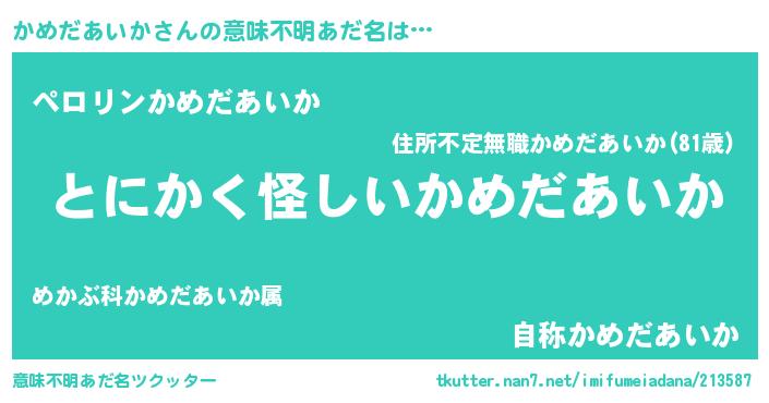 | 男性向けラノベタイトル風あだ名 | 『かめだあいかの嫁は女の子じゃないと思った?』 |
