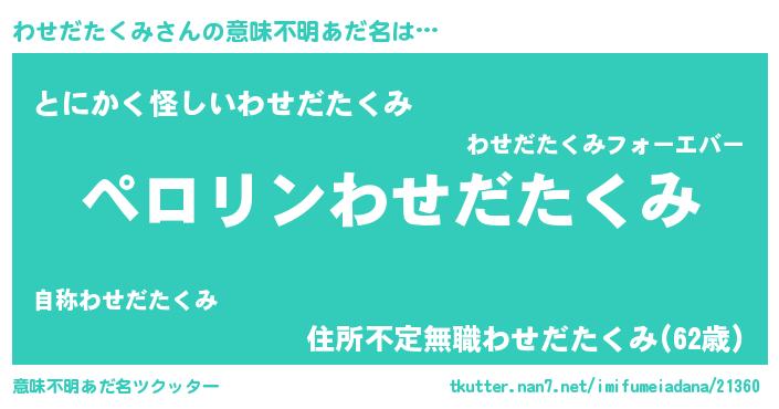 | 男性向けラノベタイトル風あだ名 | 『わせだたくみの憂鬱』 |