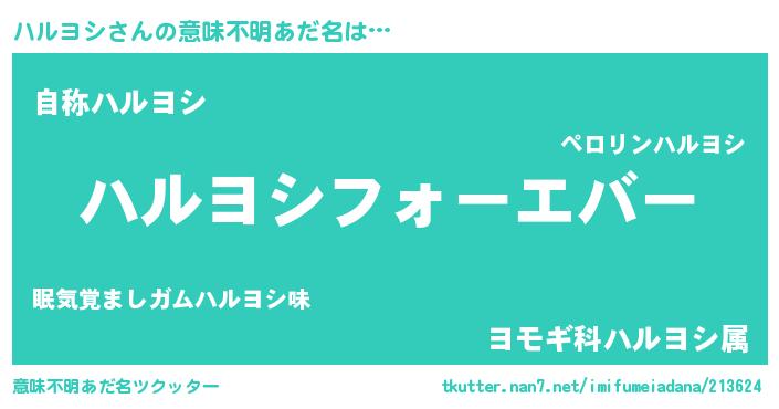 | 男性向けラノベタイトル風あだ名 | 『うちの娘の為ならば、俺はもしかしたらハルヨシも倒せるかもしれない。』 |
