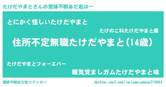 | 男性向けラノベタイトル風あだ名 | 『この素晴らしい世界にたけだやまとを!』 |