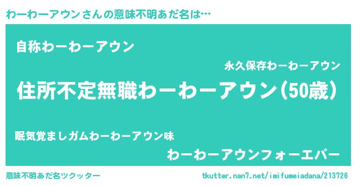 | 女子向けラノベタイトル風あだ名 | 『わーわーアウンが死なない童話 林檎のわーわーアウンの診療簿』 |